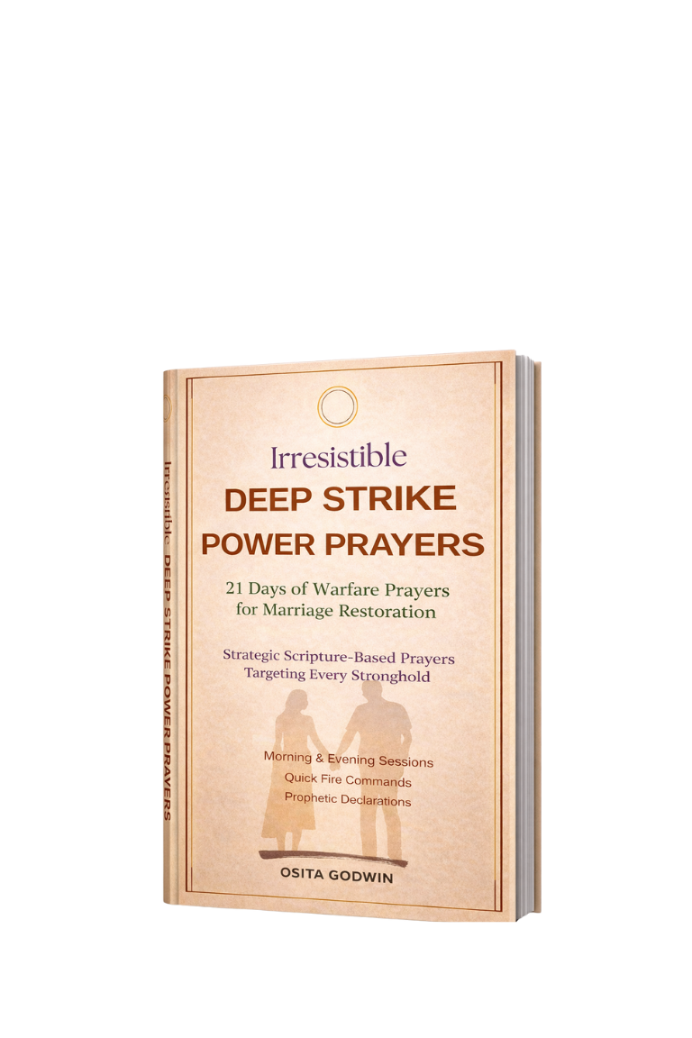 TWO EBOOK RESOURCES TO HELP YOU Earlier this year, I went back to God with one pressing question: How do we see greater, faster, and deeper marriage restorations—exactly as You revealed to me? Do we create interactive, guided virtual encounters that teach women how to pray with clarity, confidence, and authority? Or do we run prayer programs back-to-back? The answer became clear: document your experiences and the latest prayers from the Deep Strike and offer them to the women. So, precious daughter of God, you need: Preparation. Understanding. Strategy. Spiritual authority.